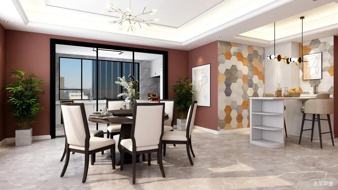表姐不喜欢大白墙设计,于是设计师完美贴合表姐的喜好,摒弃了传统的大白墙,将色彩跳跃的铁锈红应用于空间,从视觉上丰富了空间的层次感。南北通透的空间布局,让视野更为清透明亮。