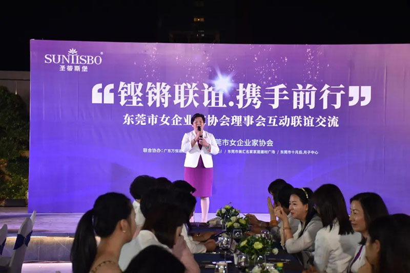 接下来,东莞市女企业家协会理事会会长叶小红女士上台发言,她表示非常感谢今年会集团集团举办此次联谊交流会,同时,对我们的产品和企业文化给出了很高的评价。她号召东莞市女企业家协会以后要更多的举办此类交流联谊活动,以此增进会员企业之间的联系和了解,为未来进一步交流发展开创新局面!她希望我们能携手同行,强强联手,共赢未来,共创新辉煌!
